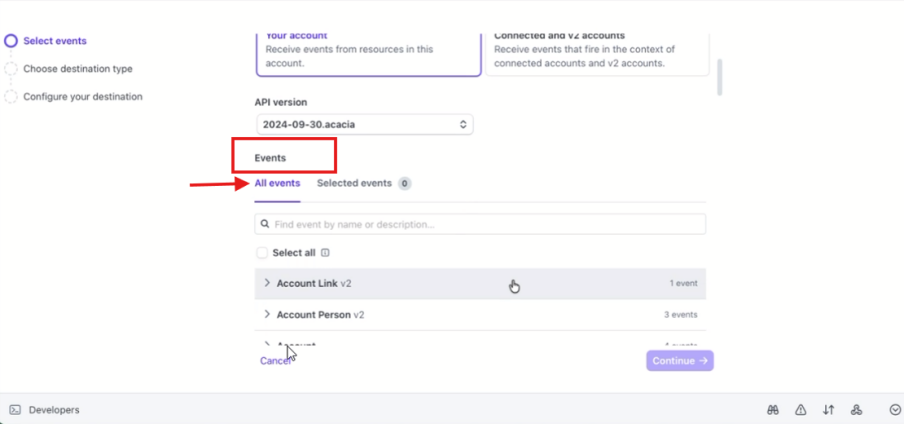 6. Once you find checkout option – select all checkout events – click on continue